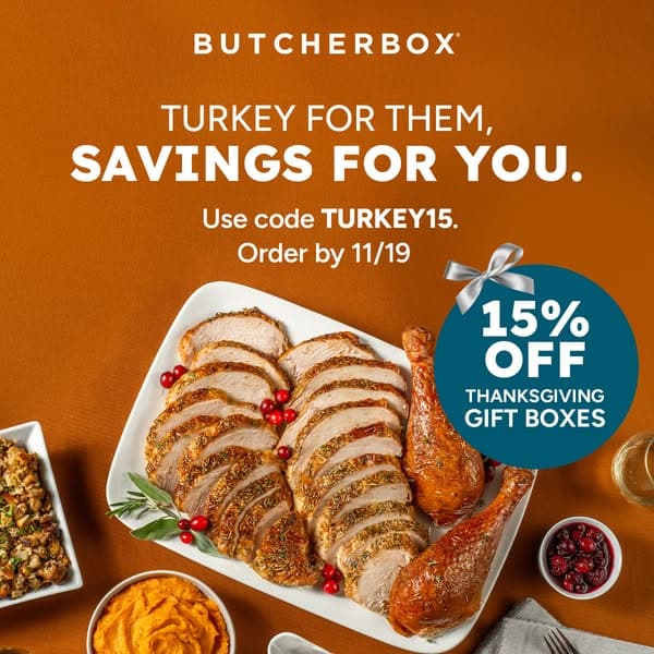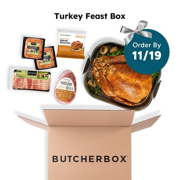 We're giving a FREE 10-14 lb turkey or 9 lb spiral ham in your first box when you sign up for ButcherBox today. Order by 11/18 to get yours in time for Thanksgiving.