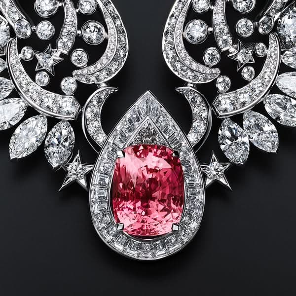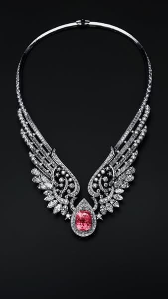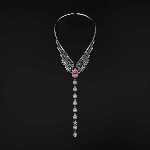 يقدّم هذا الإبداع شعارًا جديدًا جرافيكيًّا ومثيرًا للأحاسيس في عالم مجوهرات الدار: وهو جناحان مفرودان من الذهب المخرّم مثل تطريز مرصّع بأحجار كريمة يستقران برقة حول العنق. دانتيل رقيق من الجواهر، يزداد طوله بصف قابل للفصل من الماس المرصّع بالنجوم، والذي يمكن ارتداؤه على شكل سوار. في قلب هذه القلادة ولأوّل مرة في مجموعة مجوهرات راقية من مجموعات شانيل CHANEL، يتألق حجر ياقوت بادبارادشا استثنائي ونادر بقطع كوشن، يزن 19.55 قيراطًا ليضيء هذا الإبداع بوهج مشرق من خلال تدرّجه اللوني الدقيق من الوردي إلى البرتقالي.