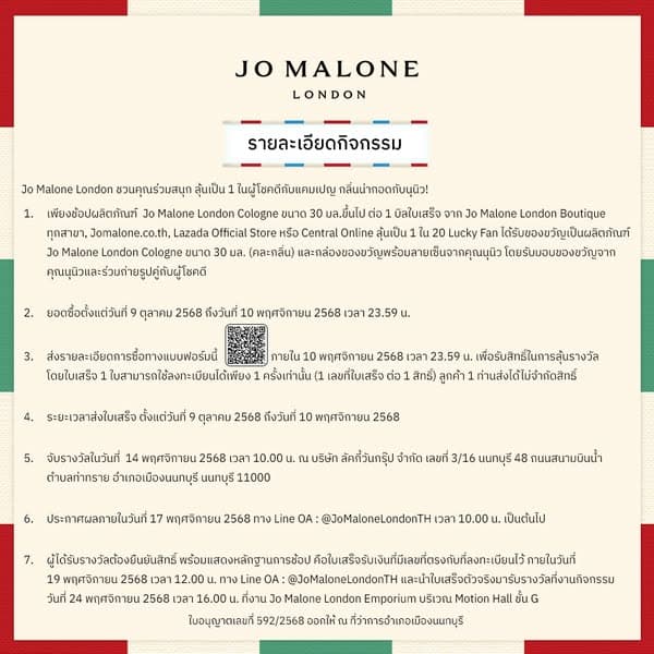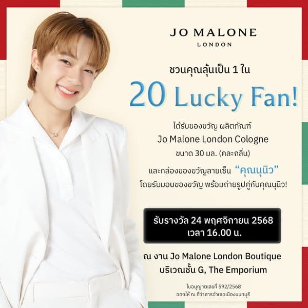 ชวนคุณร่วมสนุก ลุ้นเป็น 1 ใน 20 ผู้โชคดีกับ #กลิ่นน่ากอดกับนุนิว เมื่อช้อปผลิตภัณฑ์ Jo Malone London Cologne ขนาดใดก็ได้ ขั้นต่ำมูลค่า 3,000 บาท