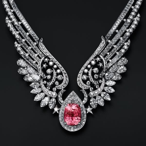 A creation that introduces a new graphic and sensual emblem into the House’s jewellery universe: spread wings in openwork gold, like embroidery set with precious stones delicately resting around the neck. An incredibly fine lace of jewels, elongated by a detachable line of star-studded diamonds that can be worn as a bracelet. At the centre of the necklace, appearing for the first time in a CHANEL High Jewellery collection, a cushion-cut Padparadscha sapphire, weighing an exceptional and rare 19.55 carats, illuminates this creation with an incandescent radiance, thanks to its subtle play of colours from pink to orange.