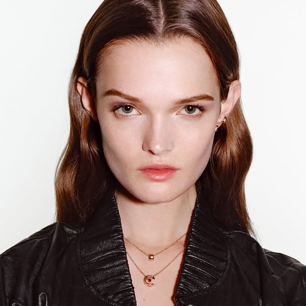 The model wears a COCO CRUSH necklace, bracelets, rings and earrings in BEIGE GOLD or white gold, with or without diamonds.