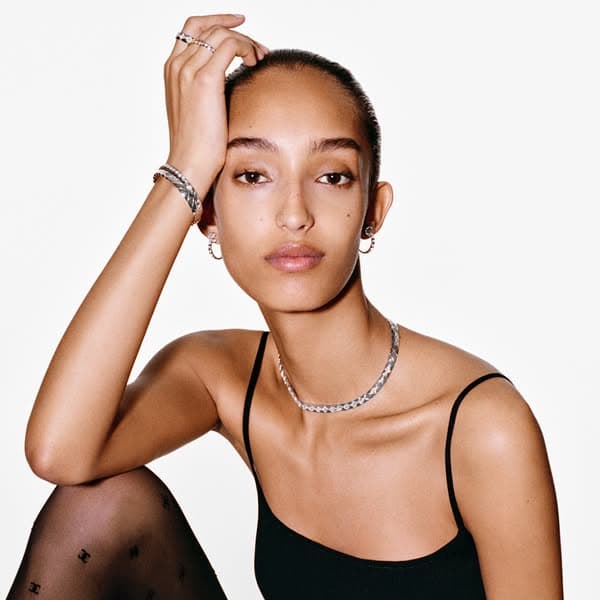 這位模特兒配戴 BEIGE 米色金或白 K 金打造,鑲鑽或非鑲鑽 COCO CRUSH 項鍊、手環、戒指和耳環。
