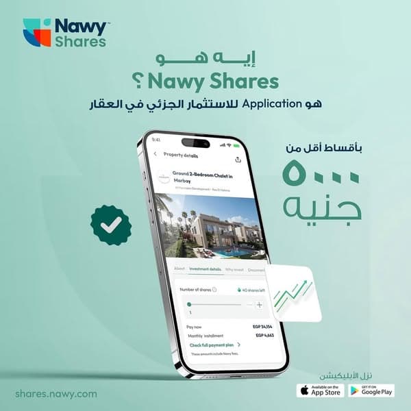 دلوقتي تقدر تدخل سوق الاستثمار العقاري وتستثمر من أول 5,000 جنيه في الشهر. مع Nawy Shares، تقدر تختار وتشتري حصة في عقار مع أكبر المطورين وفي أفضل المشاريع الموجودة؛ وكل ده أونلاين بكل سهولة من على موبايلك.