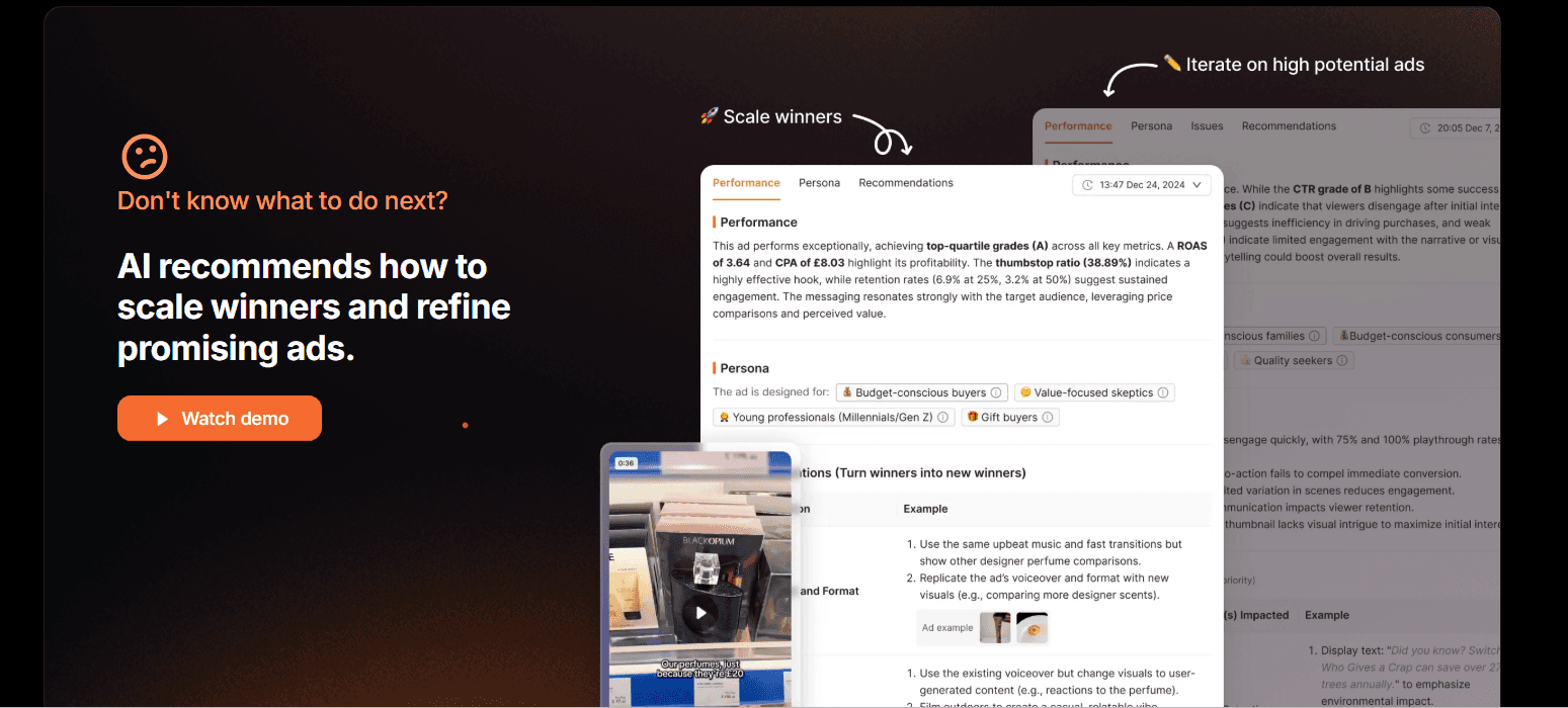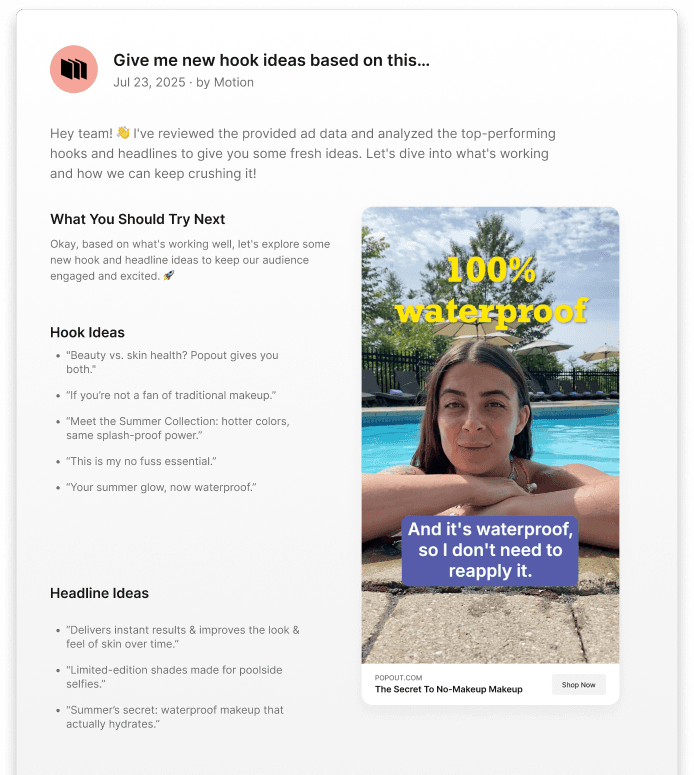 - She tags and analyzes your top creativesto surface the hooks, personas, and messages that are actually driving results.